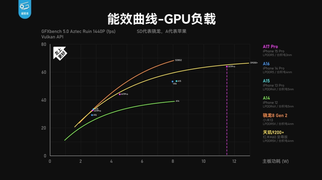 GPU方面A17 Pro的表现,比CPU要更拉胯一些。其性能相比A16确实提升20%,可峰值功耗超过11W,高到离谱。