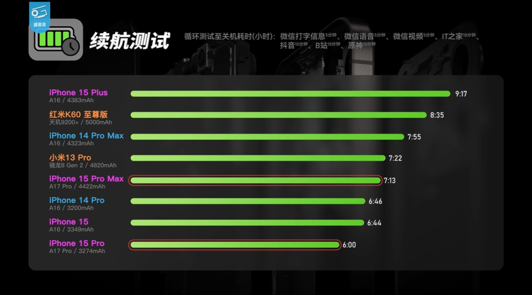 续航测试中,iPhone 15 Pro Max比上一代少了40分钟,15 Pro更是只剩下6小时,让人很没有安全感。