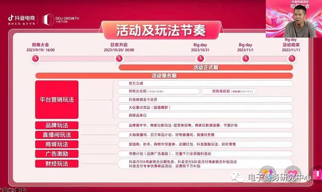 今年抖音双11总共23天,从10月20日开始,11月11日结束,期间有一次定金预售活动,从10月20日0:00至10月30日23:00为定金期,10月31日0:00至11月3日23:59为尾款期。