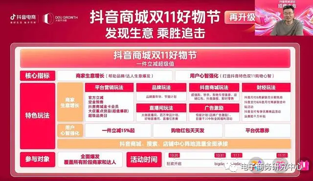 抖音电商副总裁木青在“抖音商城双11好物节”招商大会上,强调,今年双11,抖音电商货架场景、内容场景有超千亿的流量加码,同时会配合更多元化的大促玩法与官方扶持,深挖更广的全域互联互通的增量空间。