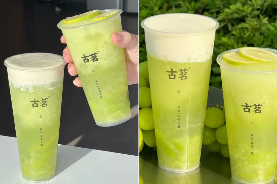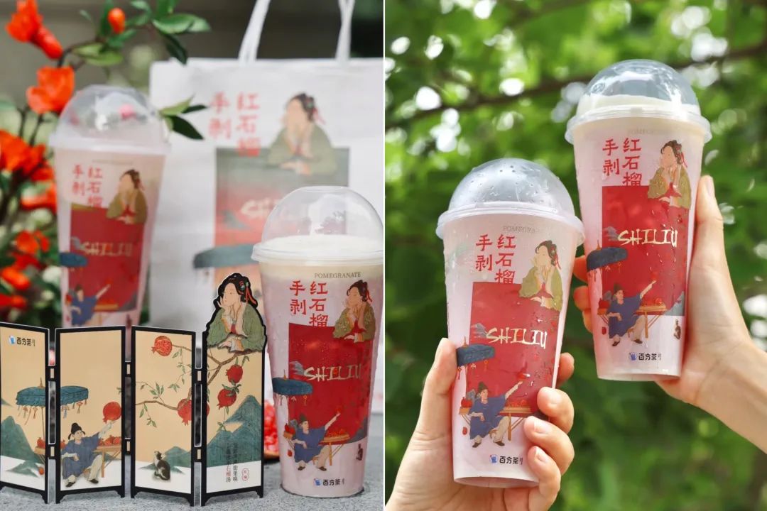 百分茶的手剥红石榴奶缇、茶颜悦色的少年庄周、古茗的芝士青提,都是用奶盖来增加饮品的口感层次。