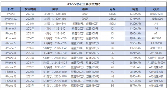 图:iPhone历史主要机型对比;来源:iPhone官网,锦缎研究院整理