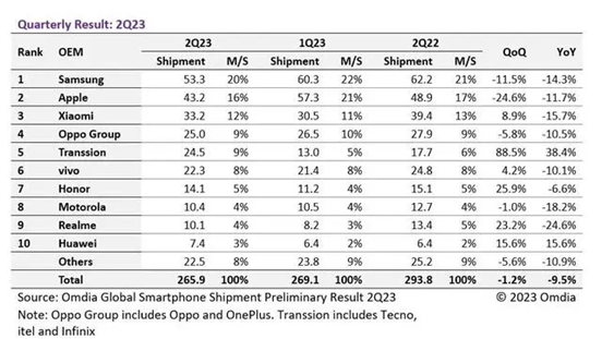 图:2023Q2全球智能手机市场出货量,来源:Omdia