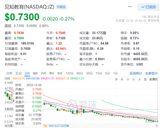 从2022年年末起,见知教育的股价便频繁波动于一美元红线上下。据此前2022年12月29日股价截图来看,当日见知教育收盘股价仅0.73美元。