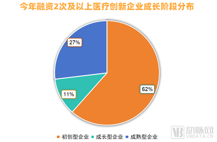 从数据上看,28家医疗创新企业若按照初创型企业(B轮以前)、成长型企业(B轮至C轮,包含C轮)、成熟型企业(C轮后)进行统计分类(以最新一轮融资轮次为依据),此次名单里的初创型企业最多,占比达到62%。