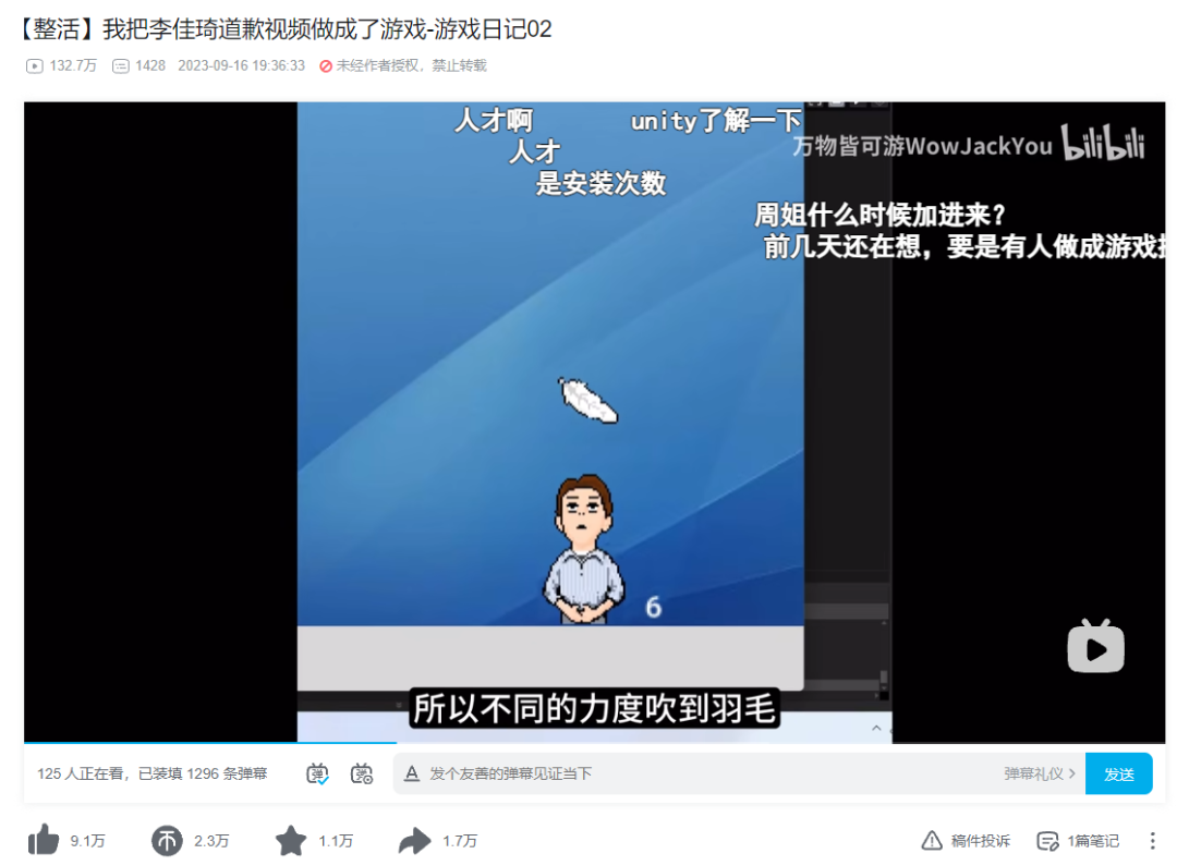 最近,茶馆在吃瓜的时候,惊讶发现已经有人将李佳琦道歉视频做成了一款游戏。这款“紧跟实事”的游戏开发过程被开发者做成了视频,视频被全网转发,且仅在B站就获得了超百万播放,而这也是这位叫做“万物皆可游”的UP主的首支百万播放视频。