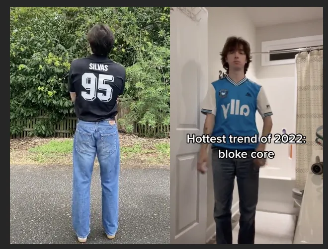 2021 年底,兰登·亨特利 (Brandon Huntley) 在圣诞节收到了一件球衣。他住在美国,23 岁,每天玩 TikTok,而且很热爱英式足球。收到球衣,穿上喇叭牛仔裤打扮一番后,他觉得自己像是个 50 岁的英国「街头小混混」,有点好笑但又觉得很喜欢……于是就在浴室门口拍了视频,开玩笑说这就叫 Blokecore 时尚。