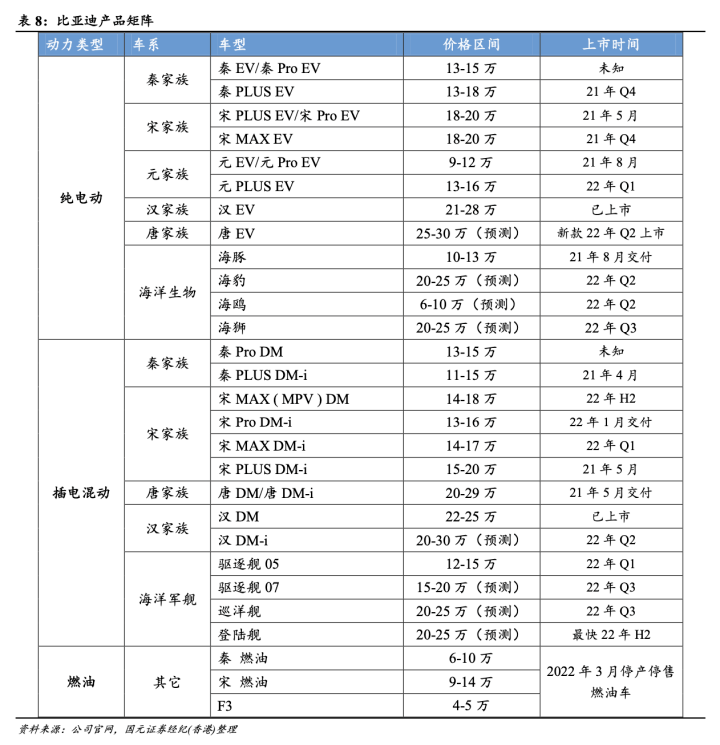 如上图所示,根据国元国际证券的统计,仅仅在2021年、2022年这两年,比亚迪推出的新能源车型就超过了20款。