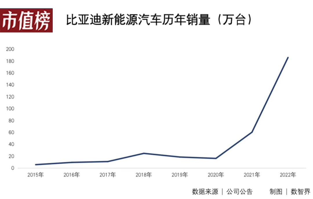 如上图,数智界统计了比亚迪从2015年至2022年的销量变化,可以看出,比亚迪的销量上涨有两个节点比较重要: