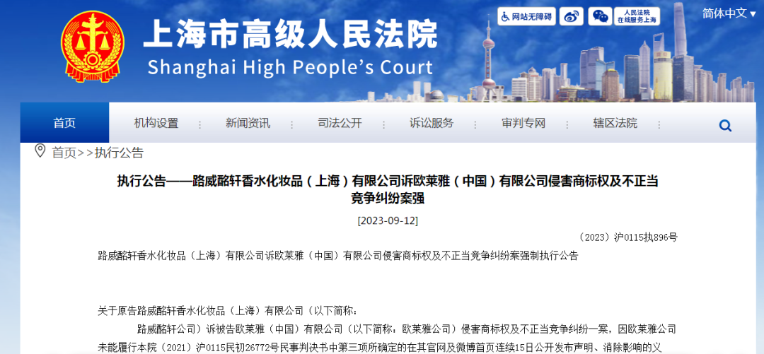 近日,据上海市浦东新区人民法院(下称法院)执行公告,娇兰起诉欧莱雅一案件,因欧莱雅(中国)有限公司(下称欧莱雅公司)未能履行公开发布声明、消除影响的义务,路威酩轩香水化妆品(上海)有限公司(下称路威酩轩公司)申请强制执行。