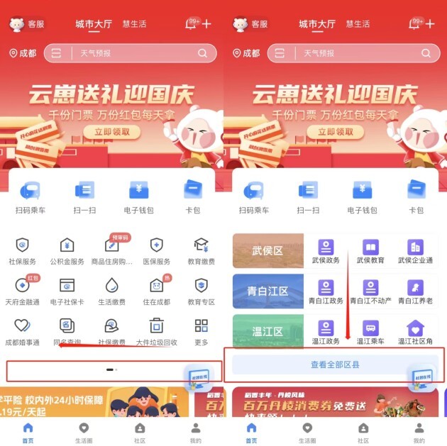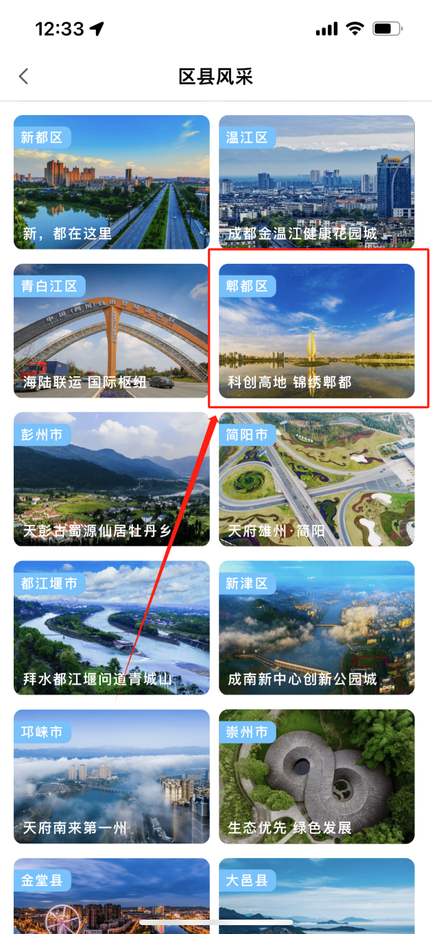 操作流程:市民可通过天府市民云APP首页服务区左滑,点击【查看全部区县】,选择【郫都区】进入门户。除此之外,也可通过顶部搜索栏输入【郫都区】找到门户入口。