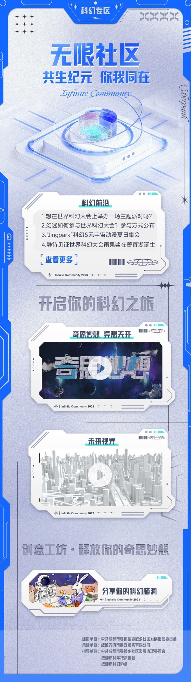 今年10月,第81届世界科幻大会将在郫都区举行,市民朋友们将迎来一场世界最高规格的科幻盛会。天府市民云郫都区门户上线科幻专区“无限社区”服务,市民朋友可一览郫都区科幻大会内容。科幻专区围绕“共生纪元 你我同在”主题,搭建了科幻前沿、科幻之旅、创意工坊等功能板块,充满硬核科技感,在专区里不仅能获取各类科幻资讯、影视、图文等相关信息,还能与志同道合的人讨论感兴趣的科幻话题。科幻专区的开发是在市委社治委、市科协以及成都市科幻协会的指导下,由郫都区委社治委建设。融入区科协、区融媒体以及各街道(镇)的信息资讯。