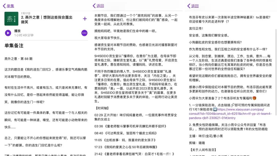 值得一提的是,目前由品牌推出的播客并不会高密度露出品牌,而是以更低调地方式将品牌理念或产品融入节目。