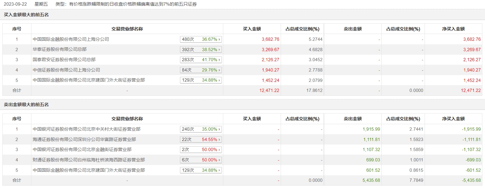 具体来看,中国银河证券北京中关村大街证券营业部、海通证券深圳分公司华富路证券营业部分别卖出1915.99万元、1111.81万元;中国国际金融上海分公司、华泰证券总部分别买入3682.76万元、3269.67万元。