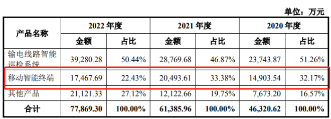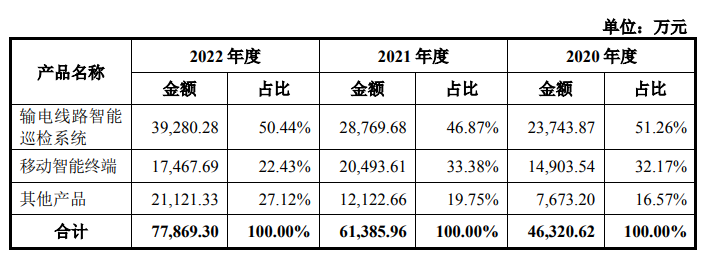 过去几年,由于行业增速较快,山东信通输电线路智能巡检系统营收一直稳步增长。2020年至2022年(以下简称“报告期内”),公司输电线路智能巡检系统收入分别为2.37亿元、2.88亿元、3.93亿元,三年内公司该业务累计增长65.82%。