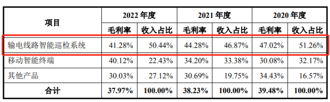 虽然公司输电线路智能巡检系统维持不错的增速,但该业务毛利率却在逐步下滑。2020年该业务毛利率为47.02%,2022年下降至41.28%。