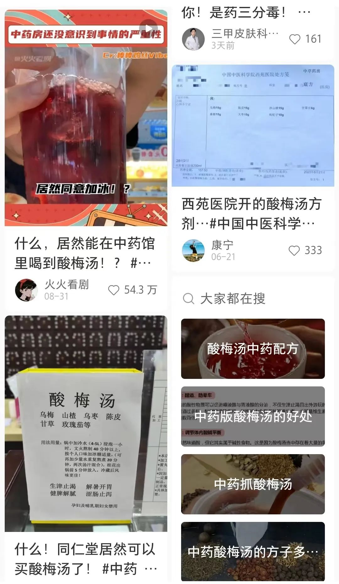 在小红书、抖音、微博等平台上,中药酸梅汤的视频火遍全网,话题“中药店买酸梅汤”也多次登上热搜,年轻人掀起了一股去中药店、中医院买酸梅汤的热潮。