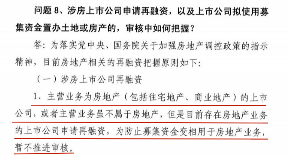 如今,这一政策限制正逐渐放开。2022年10月20日,证监会表示,对于最近一年一期房地产业务收入、利润占企业当期利润或相应指标的比例不超过10%的涉房地产企业,在确保股市融资不投向房地产业务的前提下,允许以下存在少量涉房业务但不以房地产为主业的企业在A股市场融资。