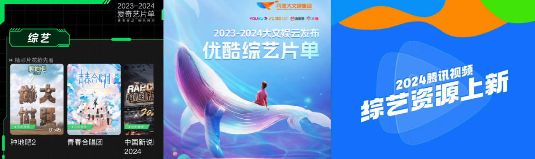 最近长视频片单发得是令人应接不暇,先是9月20日「2023-2024大文娱云发布」释出了30部优酷综艺片单,再是9月21日「2023爱奇艺iJOY悦享会」放出了26部爱奇艺片单·综艺篇,月初「腾讯视频2024V视界大会」更提早就公布了45部2024鹅厂综艺片单。