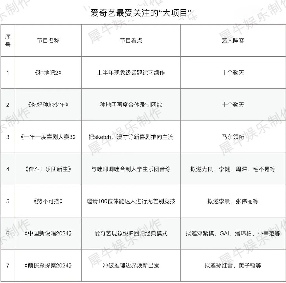 梳理来看,爱奇艺新综片单里最受关注的“大项目”几乎都是话题之作。《种地吧2》无须多言,《种地吧》作为上半年大众最爱讨论、商业化探索最成功的综艺之一,第一季就招揽到了10家以上赞助品牌,就冲这吸金力,没理由不趁热打铁推出第二季。