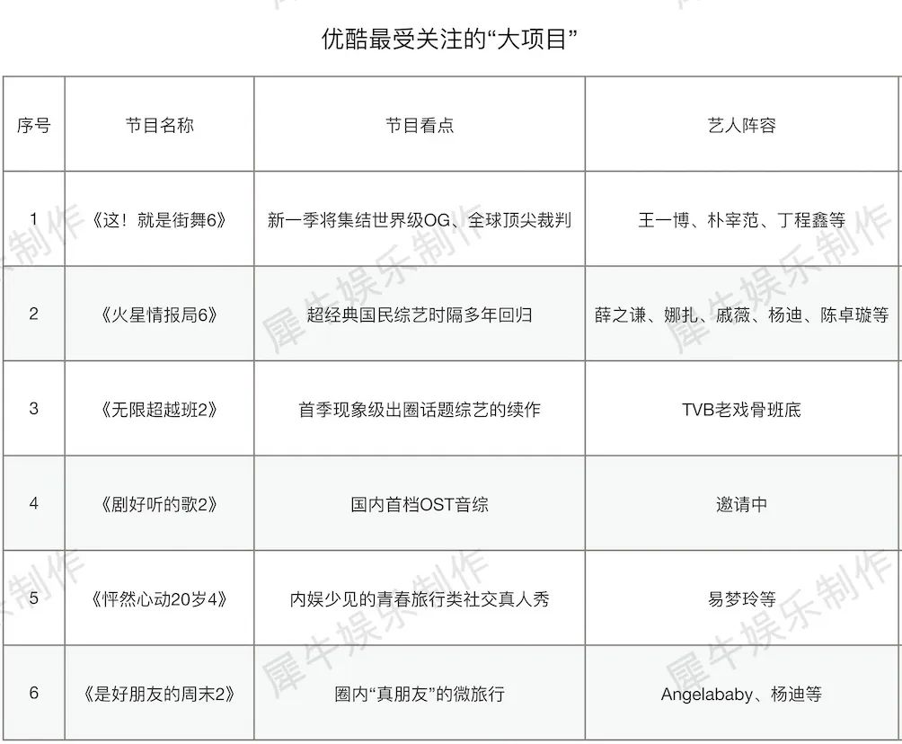 无独有偶,优酷新综片单最受关注的“大项目”也都是很有话题的综N代。《这!就是街舞6》相当典型,它是潮流综艺里的“常青树”,其上一季节目赞助数仍能达到惊人的16个,集结王一博、朴宰范等Z世代顶流的该系列仍将是优酷商业化扛鼎之作。