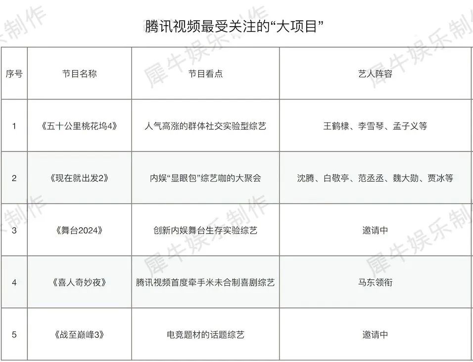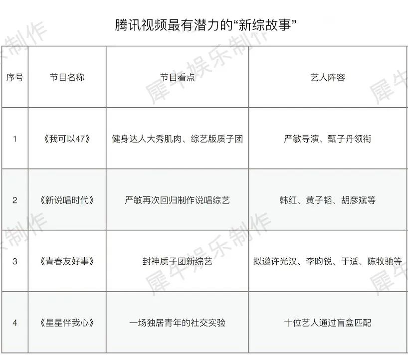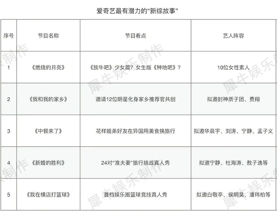 相比各平台头部大项目,这些新综艺最大的劣势就是项目推进不确定性很大。但众所周知,综艺市场的壮大必须仰仗“新综艺故事”去提供活力,从这个层面讲,犀牛君还是希望有更多金主多多关注这些“综1代”。