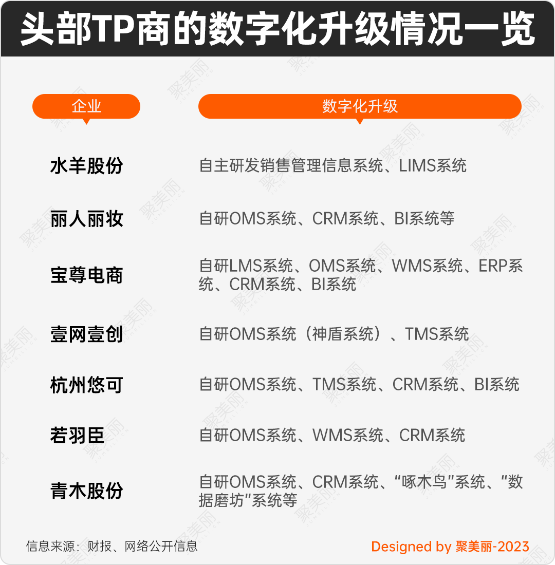 据聚美丽不完全统计发现,目前代运营商已经普遍将数字化升级视作为主要发展战略,并普遍自研IT系统,如OMS(订单管理系统)、WMS(仓库管理系统)等,已成为壹网壹创、杭州悠可等多家企业的标配。