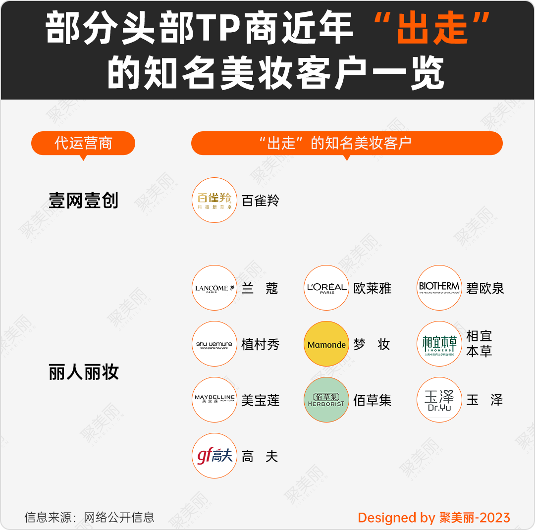 以头部DP商魔范璐玛为例,魔范璐玛目前已经先后合作了欧莱雅集团(巴黎欧莱雅、巴黎欧莱雅男士、巴黎欧莱雅美发、小美盒、理肤泉、NYX、URBAN DECAY)、资生堂集团(茵芙莎、怡丽丝尔、欧珀莱、安肌心语)、珂拉琪、橘朵、恋火等美妆企业/品牌。其中,巴黎欧莱雅的天猫业务曾由丽人丽妆运营,欧珀莱的天猫业务曾由杭州思珀特运营。