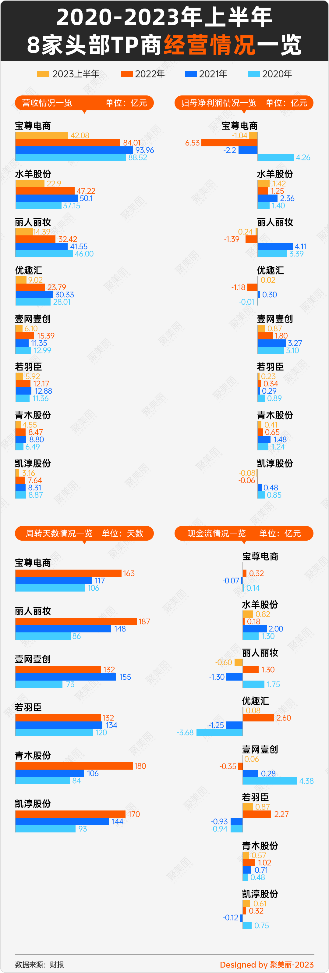3)周转天数被拉长,其中,丽人丽妆、青木股份、凯淳股份、壹网壹创的周转天数已拉长一倍,宝尊也拉长了近三分之一,若羽臣拉长近半个月。