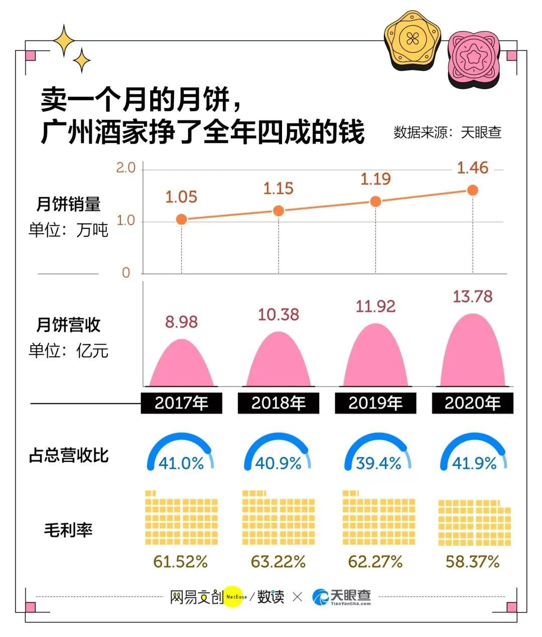 月饼生意到底有多赚钱呢?以广式月饼中的佼佼者“广州酒家”为例,从2017年开始,广州酒店月饼销量连年攀升,仅2020年就卖出了1.46万吨的月饼,如果一块月饼按100g来算,够全国人民一人分一块了。
