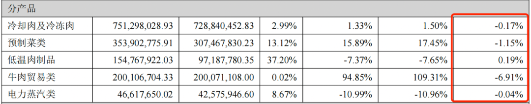 此外,分产品来看,得利斯的冷却肉及冷冻肉的毛利率为2.99%,较上年同期减少0.17%;预制菜毛利率为13.12%,比上年同期减少1.15%;牛肉贸易类产品毛利率仅有0.02%,比上年同期减少6.91%;电力蒸汽类产品毛利率为8.67%,比上年同期减少0.04%。