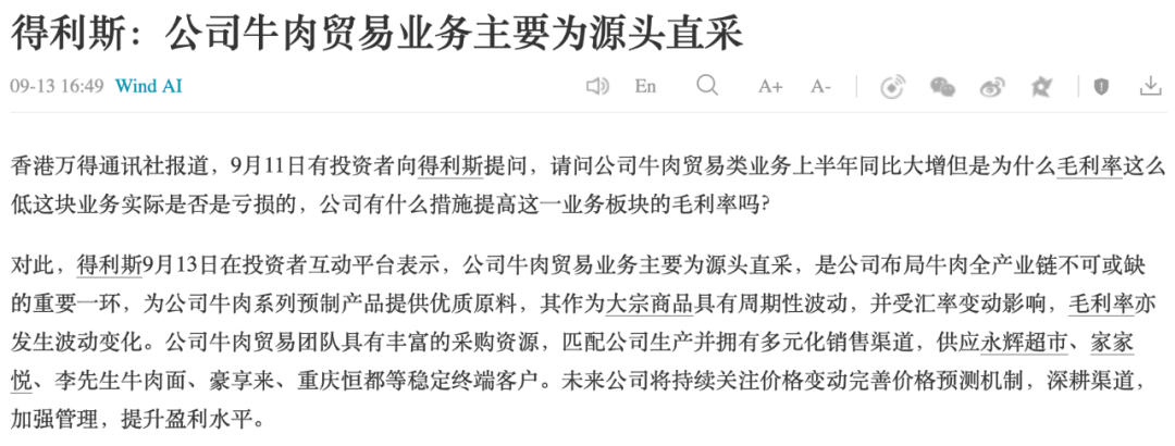 根据香港万得通讯社报道,9月11日,有投资者针对得利斯牛肉贸易类业务是否亏损等情况进行提问。