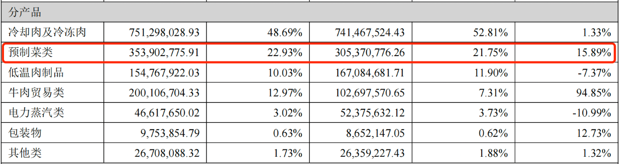 得利斯的预制菜业务包含速冻调理产品、牛肉系列产品、即食休闲类产品、速冻米面制品四大类。半年报显示,2023年上半年,公司的预制菜类的收入3.54亿元,占当期营业收入的比例为22.93%,较上年同期增长了15.89%,是公司除牛肉贸易类产品外,增速最快的业务品类。