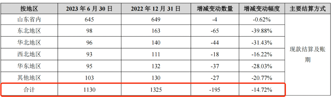 2022年末,公司共有1325家经销商,主要集中在山东省内。而到了2023年上半年末,公司的经销商减少至1130家。短短半年的时间就减少了195家经销商,东北、华北地区经销商数量更是减少了超过三分之一。