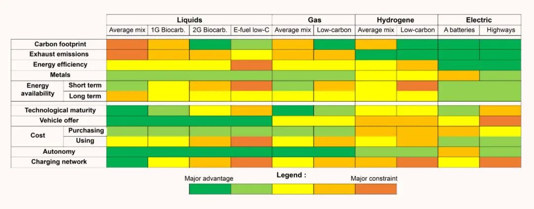 注:长途重型货车各种脱碳方案的优劣势程度,颜色越接近绿色说明该方案优势越突出,越接近橙色说明劣势越突出 [16]。
