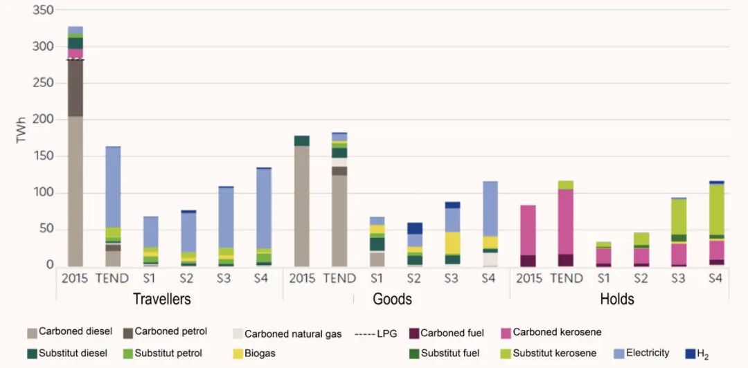 为了摆脱石油,未来的货运将不得不依赖多种能源,而客运将以电气化为主(如下图所示[19])。