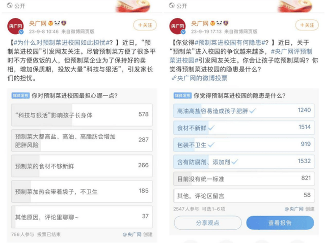 但据@央广网官微发布的#为什么对预制菜进校园如此担忧#和#预制菜进校园有何隐患#的投票中,预制菜食材不新鲜、“科技与狠活”影响孩子长身体仍是家中担忧的问题。基于此,部分家长干脆直接辞职给孩子送饭。