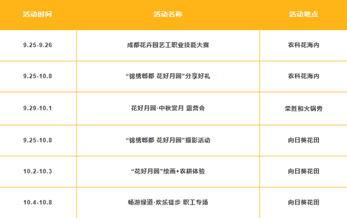500亩向日葵花海、超浪漫的皓月露营会、中秋主题摄影展、绘画+农耕体验、精彩绝伦的花卉园艺工比赛,还有各色美食吃不够、后备箱集市逛不停……