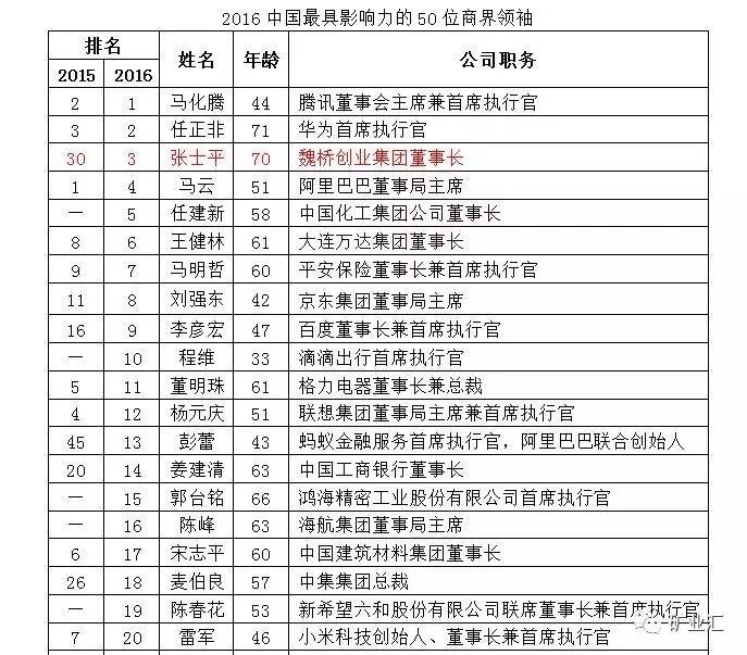 今天,咱看一下2016年《财富》杂志评选的“中国最具影响力的50位商界领袖”。