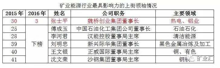 2015年共有6位矿业能源行业老总上榜,但2016年仅剩魏桥创业集团董事长张世平一人,且从2015年第30位上升到今年第3位,其余五位矿业能源行业老总均下榜。