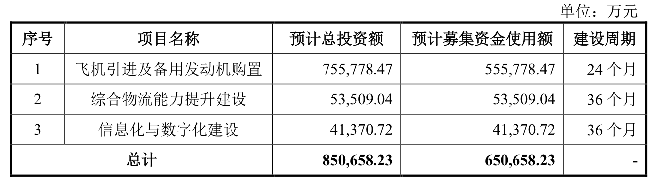 此次融资的65亿,将分别投入到“飞机引进及备用发动机购置”、“综合物流能力提升建设”、“信息化与数字化建设”中。
