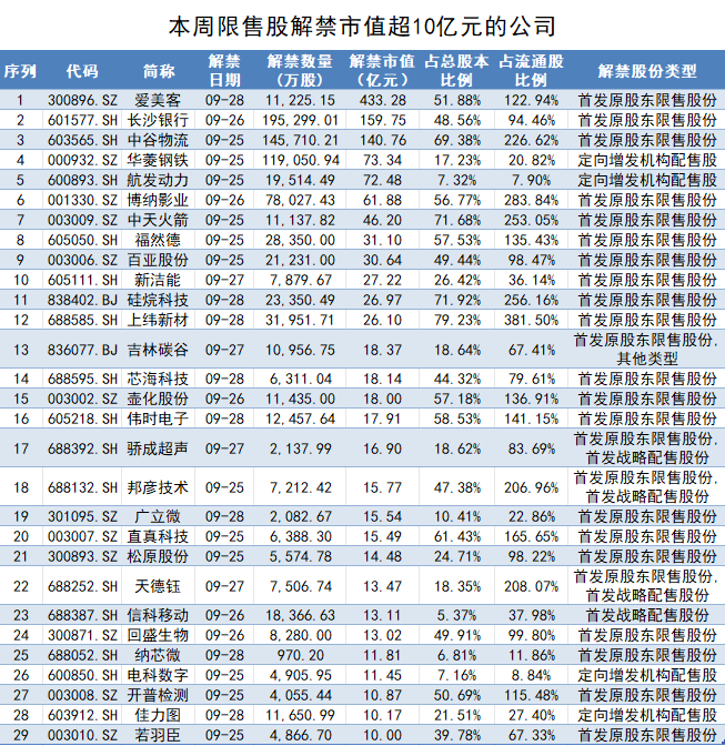本周解禁市值超过10亿元的公司有29家,爱美客(300896.SZ)、长沙银行(601577.SH)、中谷物流(603565.SH)三家公司解禁市值超100亿元。华菱钢铁(000932.SZ)、航发动力(600893.SH)、博纳影业(001330.SZ)三家公司也各有超过60亿元的解禁规模。