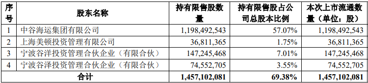 海运公司中谷物流同样是上市三年期首发限售股解禁,解禁股东为公司第一、二、三、四大股东。截至发稿时,暂未有股东提出减持计划。