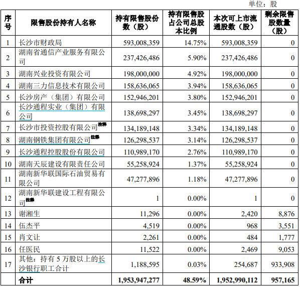 上市已满五年的长沙银行本周迎来一批首发限售股解禁,解禁数量19.53亿股,占总股本比例48.56%,解禁市值159.75亿元。