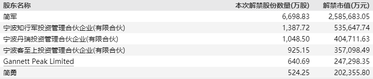 医美龙头爱美客是本周解禁规模最大的公司。根据计划,公司9月28日将有1.12亿股首发限售股上市流通,占总股本比例的51.88%。此次为公司上市三年期首发限售股解禁,涉及股东包括实控人简军,第二、四、五、七大股东,此外还有简勇。