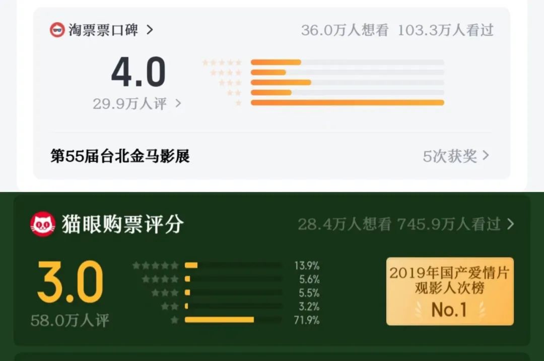 电影的晦涩与作者性很显然与大众预期的浪漫形态相违背,当情侣们坐在影院里面面相觑的时候,电影也在一夜之间发生了翻天覆地的变化。累计票房2.82亿,上映当天卖了2.62亿,元旦当天只收获了一千万票房,简直是断崖式跳水,与此同时各大电影评分软件上对于此片也是恶评如潮,猫眼3.0分,淘票票上也只有4.0的评分。