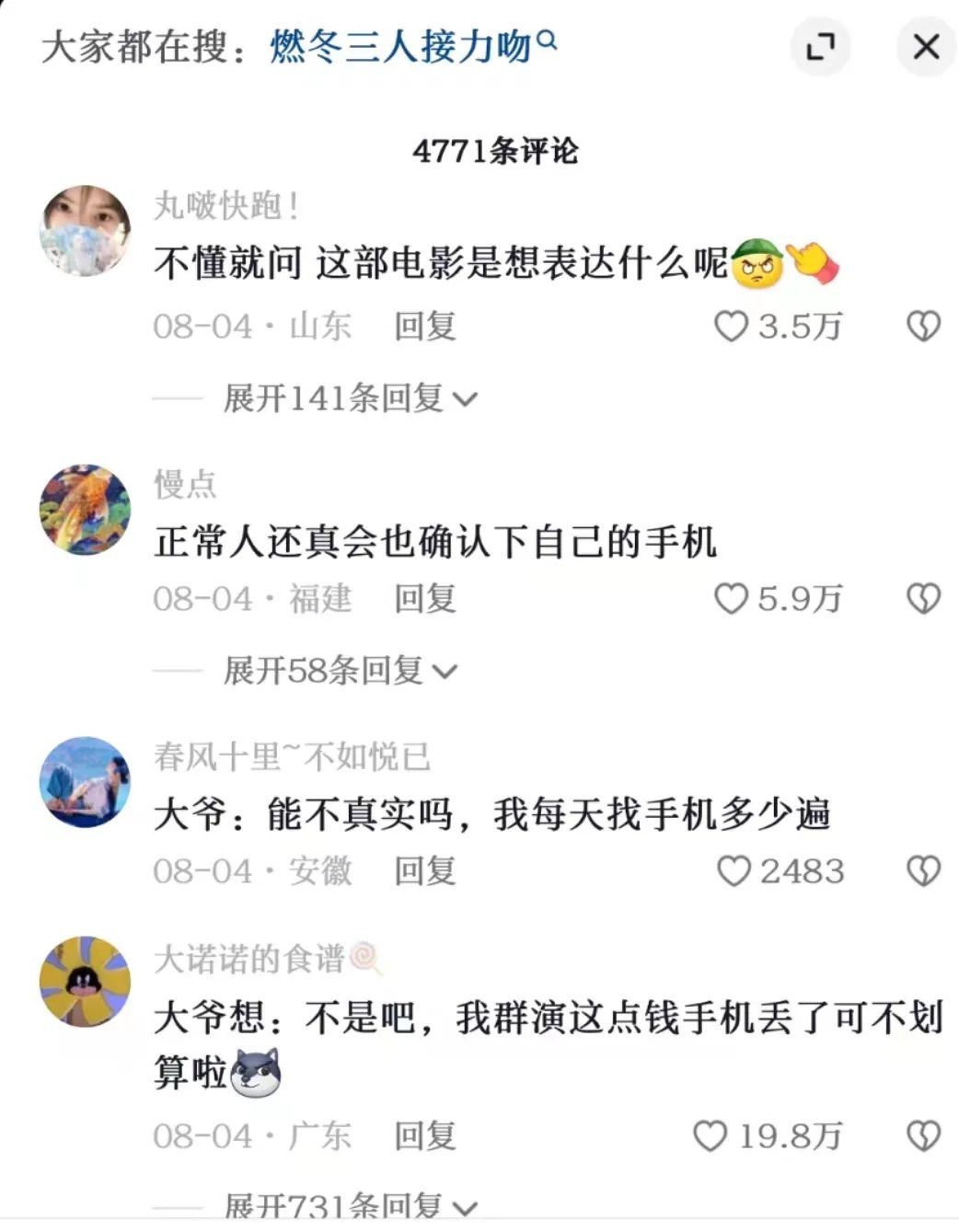文艺片们同样也想要复刻商业片们的成功,它们也选择将宣发铺开,在各种社交平台上进行着相同类型的营销策略:《燃冬》抖音官方账号4.4万粉丝,最火的几条作品下面都是普通观众的吐槽与戏谑。作品文案单拎出来完全没有任何问题,调性与口吻也是符合平台特色,但是观众就是不买单,想要以这种方式吸引过来“自来水”,没想到却事与愿违,在抖音上口碑崩盘。爱情主题与“三人行”话题,看起来很接地气的电影标签,然而观众们的反映却是“很难进入”、“完全不不懂”这样子的字眼。如果一部电影无法与观众建立起连接的通道,又如何在上映的时间段里进行有效的二次传播呢?如果说下沉式营销是在拓宽文艺电影的受众面,那么这样子“漏斗型”筛选结果真的是片方真正所期待的结果么?