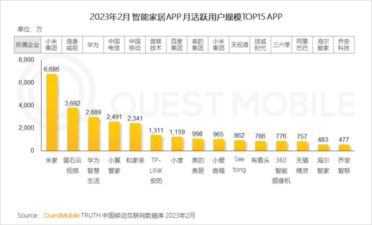 QuestMobile显示,截至今年2月,海尔智家智能家居APP月活跃用户规模仅有483万,大幅落后于小米、华为,同百度与阿里等互联网玩家相比亦占不到优势。