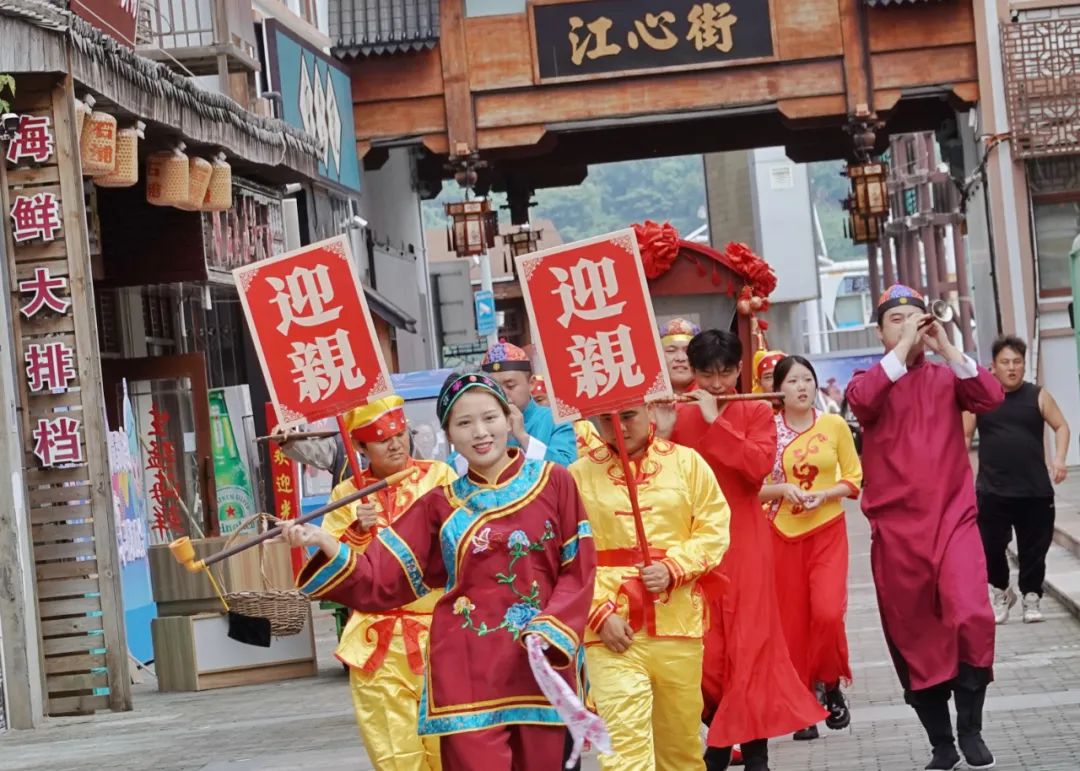 由媒婆喜婆及村姑若干、乐手三人,迎亲花轿、挑夫背夫及仆人组成的迎亲场面重现了浙江沿海地区,热热闹闹展现了旧时在婚俗中流行“婚嫁”习俗。