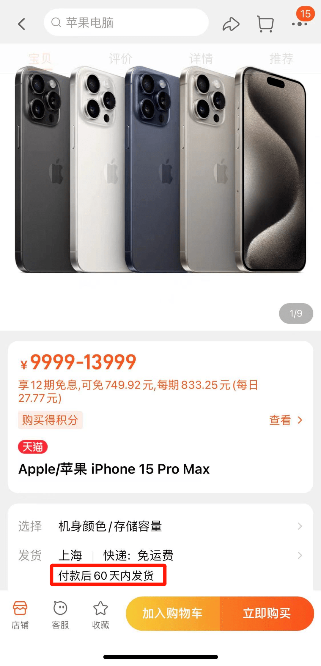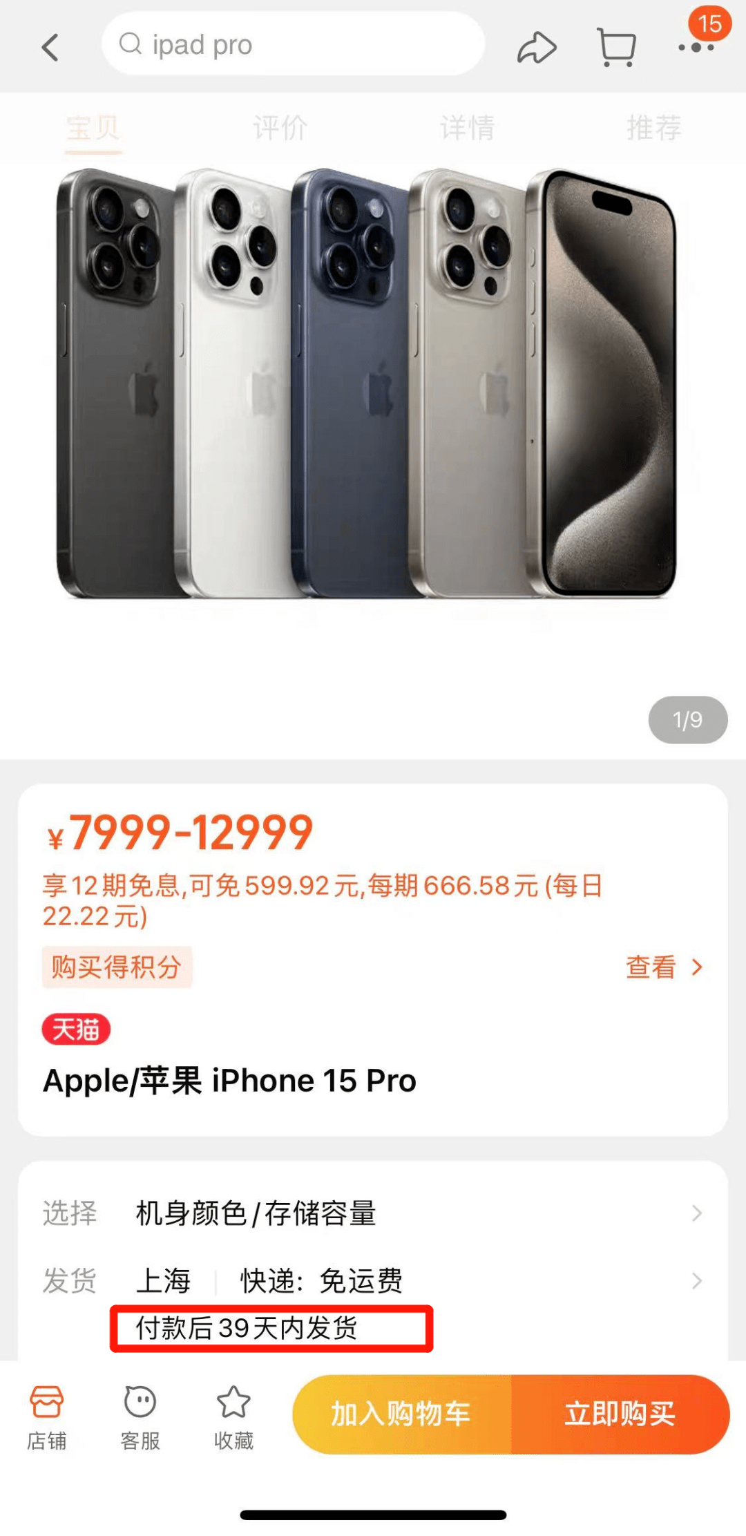在拼多多上,iPhone15系列参加百亿补贴活动,起步价5598元,比原价直降400元左右。记者注意到,全网都需等待近一个月的Pro机型,拼多多目前仍可以购买,且购买页面显示“9月28日发完”。